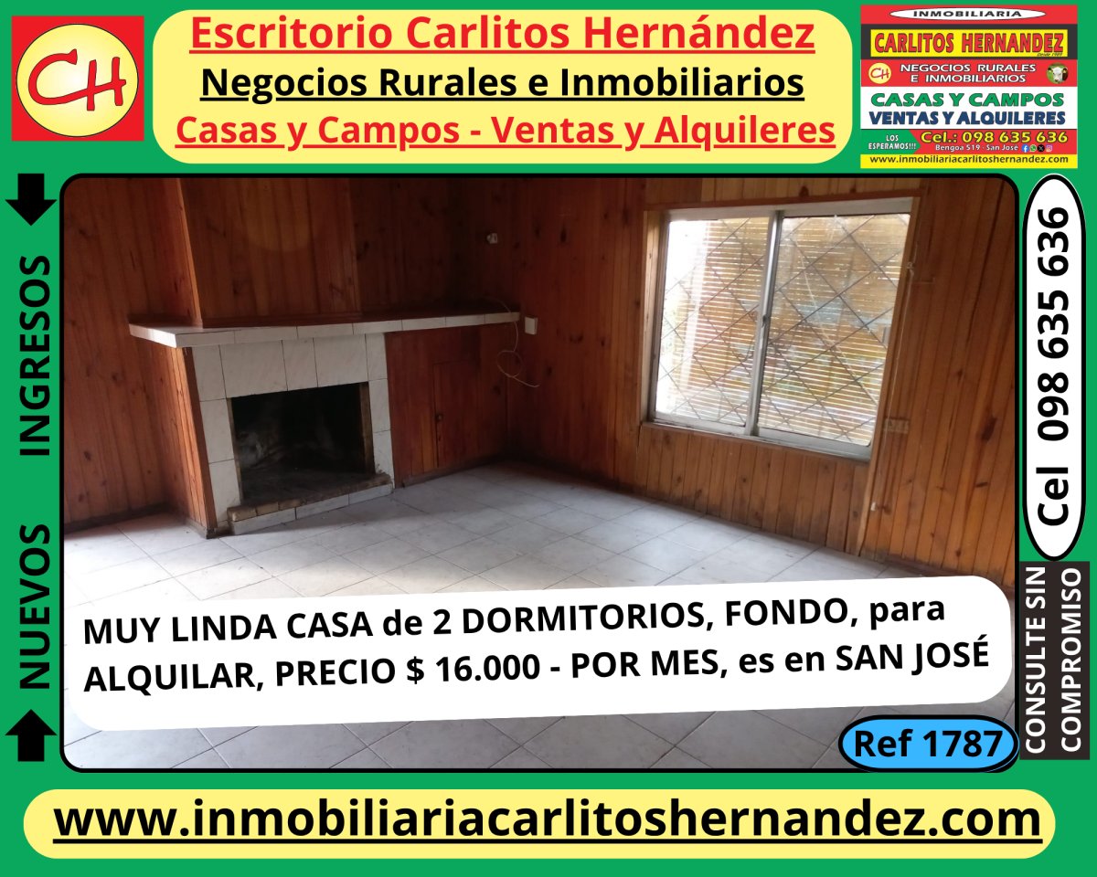 Ref 1787) A - 🏘🏘 MUY LINDA CASA de 2 DORMITORIOS 🛏 🛏, FONDO 😺🐶, GARAJE 🚘🚘 , para ALQUILAR 💲 💲 , es en ZONA ESTADIO en SAN JOSÉ 👈👈