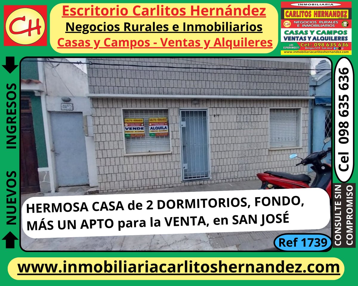 Ref 1739) V - 🏘🏘 HERMOSA CASA de 2 DORMITORIOS,🛌🛌 con BUEN FONDO 🌳🌳 más un APARTAMENTO 🏠🏠 para la VENTA, 💲 💲 es en SAN JOSÉ 👈👈